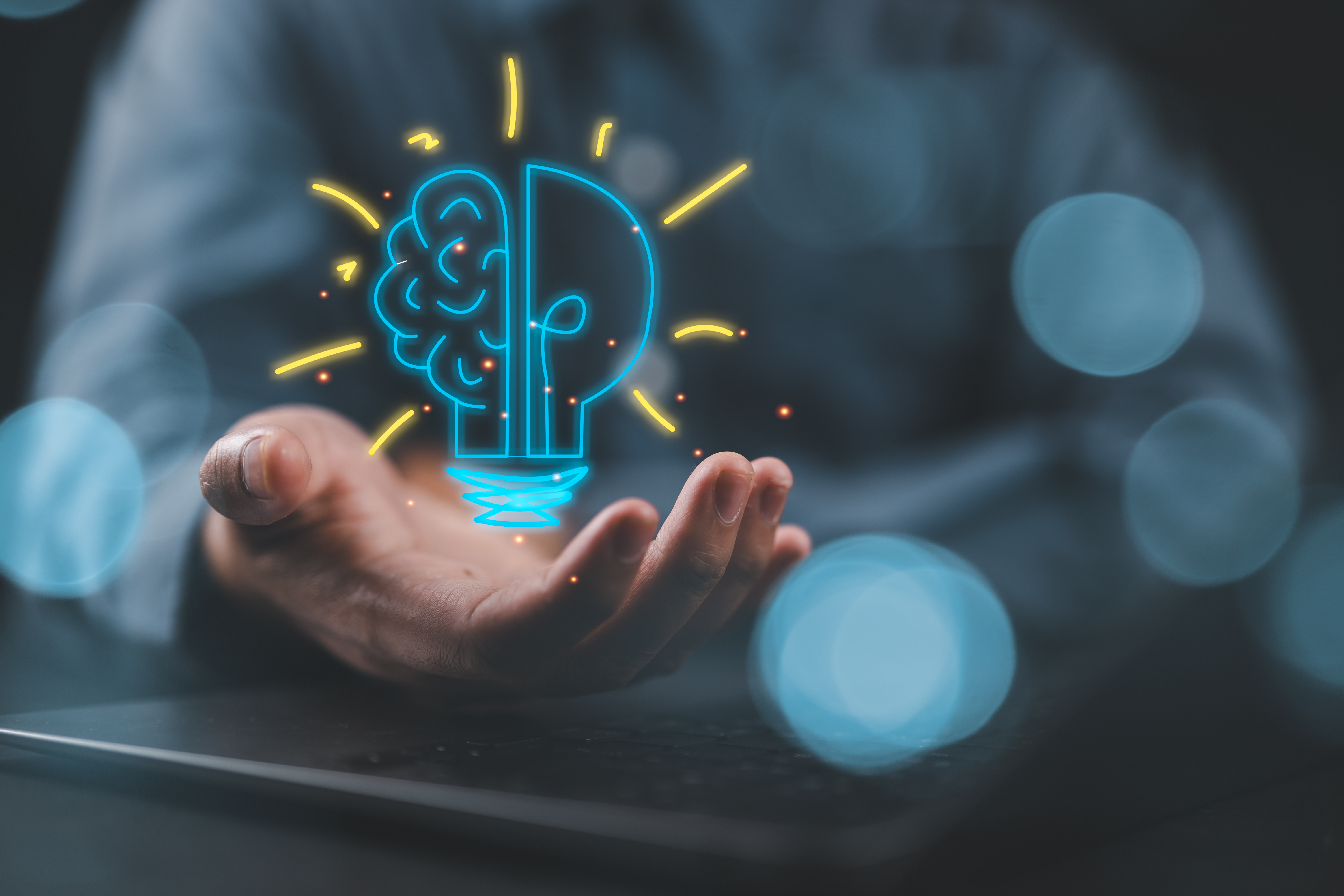 Visualisierung einer Idee. Mann hält eine gezeichnete Glühbirne in der Hand.
